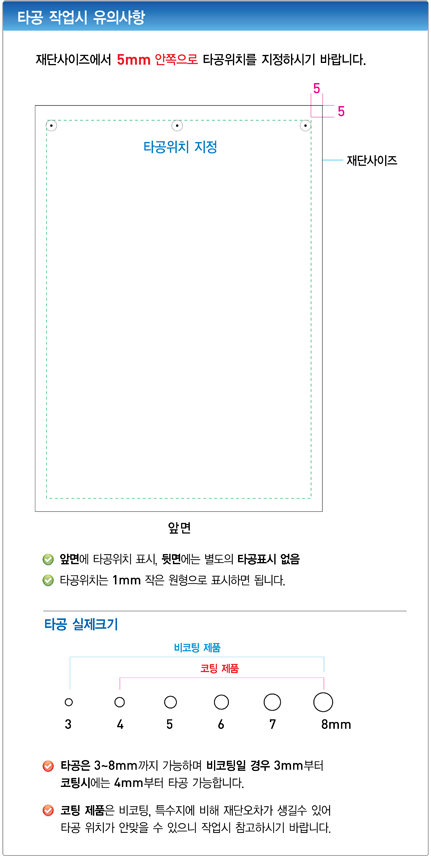 • 재단시, 인쇄 제작 공정에 의하여 1~2mm의 재단오차가 발생할 수 있으므로 재단사이즈에서 약 3~4mm정도 안으로 작업 후 접수해 주시기 바랍니다.